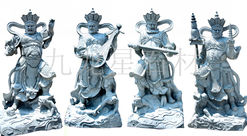 四大天王的信仰早見于佛經(jīng),如毗婆沙論云:佛初下生,四天王以天繒接天子身,置寶幾上。逾城之時(shí),四天王捧馬四足。佛法傳到中國,在唐代時(shí),四天王造像極為稀有,因?yàn)楫?dāng)時(shí)的四天王的信仰,一直集中在北方天王的身上,直到明清,四天王的信仰才普遍開來。由于受到封神榜民間傳說的影響,明代把整個(gè)四天王的造像,都去向封神榜看齊。給每尊天王都配置了一件法器;封神榜說他彈琵琶,那么就給他塑琵琶,封神榜說他拿寶傘就拿寶傘。實(shí)際上在經(jīng)典上面,沒有拿這些法器的記載,但有拿刀的、拿戟的、有托塔的、有拿珠的。