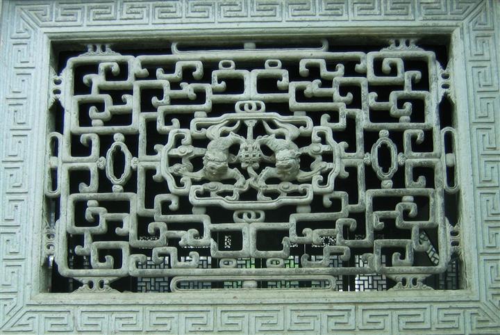石窗以長(zhǎng)方形為最多,還有方形、圓形、拱形等。長(zhǎng)方形的石窗一般以直式為多,橫式次之。石窗窗心的形態(tài)更是多樣,窗心有不分層的,也有分層的,分層的多分為二層或三層。分為二層的,多有主次之分,或上大下小,或上小下大,大的部分作主題紋飾,小的部分作輔助紋飾。分為三層的多以中心一層最大,上下兩層大小對(duì)稱。不分層的或作一整體雕刻,或在中心作一主題雕刻,四周圍繞各種裝飾。中心雕刻的形狀有非常多的變化,或方或圓,或扇形,或瓶形,或多角形,不一而足。中心雕刻使石窗主題更加突出,在裝飾上又增添了變化,在視覺上更加豐富。