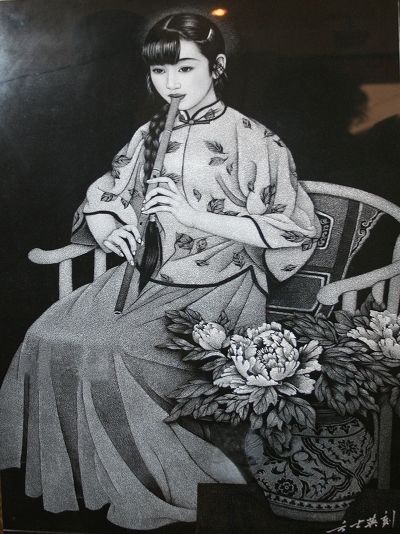 影雕,顧名思義其雕刻形象逼真,猶如攝影。它是以早年的“針黑白”工藝為基礎(chǔ)發(fā)展創(chuàng)新的一種新工藝,在僅1.5公分厚、磨得锃亮的青石板上,用粗細(xì)不同的各種微型鋼釬,靠著鉛點(diǎn)的大小、深淺、粗細(xì)、疏密和虛實(shí)的有機(jī)結(jié)合,精心雕琢,相應(yīng)成像。它不僅能充分表現(xiàn)出原作的真實(shí)意境,而且能展現(xiàn)石雕獨(dú)特的藝術(shù)風(fēng)格和魅力。其雕琢的畫面無(wú)不纖細(xì)入微,超塵脫俗。