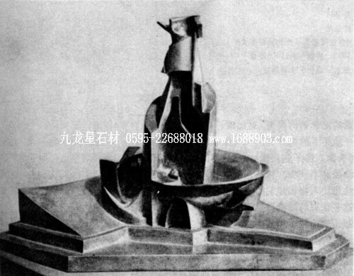 波菊尼在《未來主義雕塑技巧的宣言》中主張“絕對和完全廢除確定的線條和不要精密刻劃的雕塑。我們要把人物打開, 把它納入境之中……透明的玻璃、鐵塊、金屬絲、室內(nèi)和室外的燈光能夠表示平面、方向以及一種新的現(xiàn)實的調(diào)子和中間調(diào)子”。(6)未來主義者就是希望達到讓作品與環(huán)境、形體與空間互相貫穿。波菊尼在他的《空間中一個瓶子的發(fā)展》這件靜物雕塑上, 傳統(tǒng)的雕塑空間被擴大。瓶子被解體后又重新構成, 但作品此時已經(jīng)和介于它與環(huán)境之間的基座融為一體, 呈現(xiàn)一種向空間極度擴張的態(tài)勢。這件僅有15英寸高的青銅作品卻能盤居著一個巨大的空間量。他還通過其它作品的實驗,驗證了他在雕塑中所追求的永久價值——“運動的風格”和“雕塑即環(huán)境”, 而這反倒是另一種對“未來”的預言:其“運動”真的波及到達達主義、超現(xiàn)實主義雕塑以及波普雕塑家環(huán)境流派的“環(huán)境”觀。