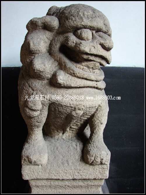 子是莊園青石雕刻的又一大類別。眾多的門墩石獅,經(jīng)清代民間藝術家的大膽想象、沿承、夸張,這一藝術品成了宅第建筑中不可替代的裝飾像,無論體量大小,均威武、高貴而又憨態(tài)可掬。為增強裝飾效果,莊園的獅子形象大多頭大臉闊,額隆頰豐,箕口肉鼻,前額突出,從禿頂式的頭部到項背披有漩式鬣毛。胸飾纓絡華飾,脖上掛有鈴鐺,形態(tài)俯首縮足。雌獅掌撫幼獅,有的還背負其子;雄獅腳踏繡球或嘴銜彩帶,背負繡球,較多地汲取了民間傳統(tǒng)舞獅藝術的成分,富有較強的鄉(xiāng)土氣息和喜慶風格。