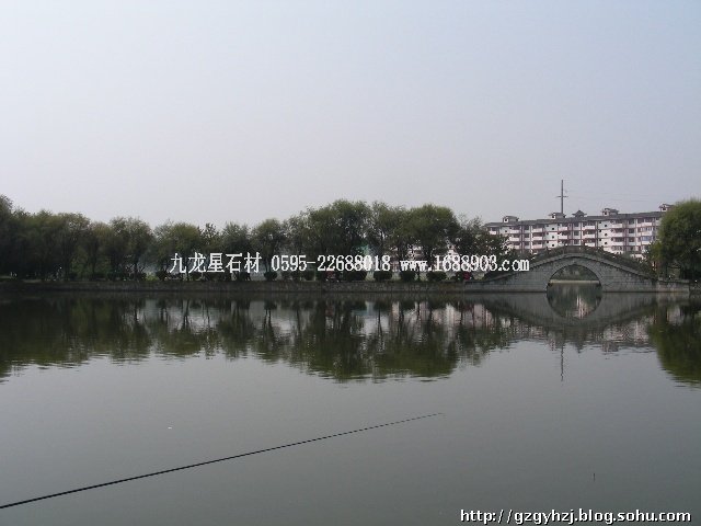 小橋綠樹(shù)垂竿倒影水中,景色麗人。