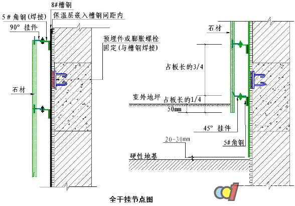說明:(1)室外花崗巖最低處必須低于室外地坪50,預防室外地面沉降時花崗巖露邊;(2)槽鋼離開硬性地面20~30mm。
