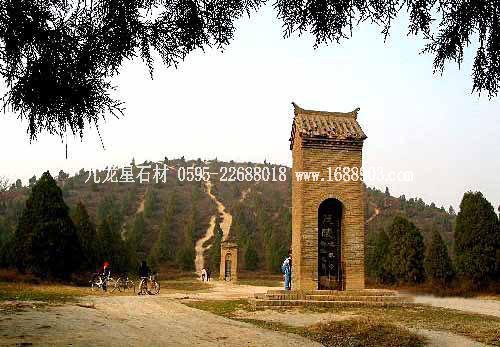 乾陵是唐朝第三代皇帝李治和女皇武則天的合葬陵,位于陜西省乾縣城北6公里的梁山上,距西安80公里。東有豹谷,西有漢谷,依山為闕,氣勢雄偉。這是唐十八陵中最有代表性和迄今保存最好的一座陵墓。陵園內(nèi)城的南北城墻各長1450米,東墻長1582米,西墻長1438米,墻體厚2.4米。乾陵的地面設(shè)置,遺留到現(xiàn)在的主要是陵墓石刻。這些石刻十分精美,屹立在梁山之巔,至今已有1200多年的歷史。另還有朱雀門外兩座大碑,即“七節(jié)碑”和著名的“無字碑”,以及石像61尊。圖片: