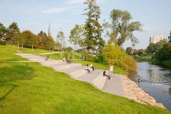 這座公園位于利珀河畔,設(shè)計(jì)師遇到的主要挑戰(zhàn)便是公園與河道間5米的落差。面對(duì)這個(gè)問(wèn)題,設(shè)計(jì)師修建了一條步道和幾組臺(tái)階,讓這里可作為戶外活動(dòng)的露天劇場(chǎng)。這樣的設(shè)計(jì)既保留住了原有的景觀,又讓河道依舊是整個(gè)景觀的亮點(diǎn)。