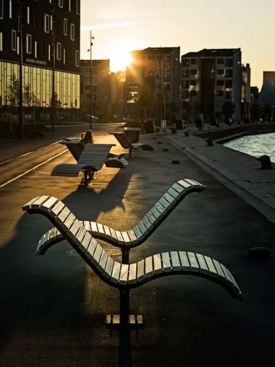 Aalborg Waterfront II是該景觀項(xiàng)目的二期工程,此次設(shè)計(jì)依舊用景觀大道將周邊景致整合起來(lái)。在平坦的前灘后是一些凸起的小山丘,設(shè)計(jì)師從這些自然景色中獲取靈感,將基底抬高,上面建有連貫成片的臺(tái)階,既可以用于抵御洪水,又是可休憩的坐凳。項(xiàng)目中采用原生簡(jiǎn)單的材料,在一系列的開闊廣場(chǎng)上種植了茂密的樹林。