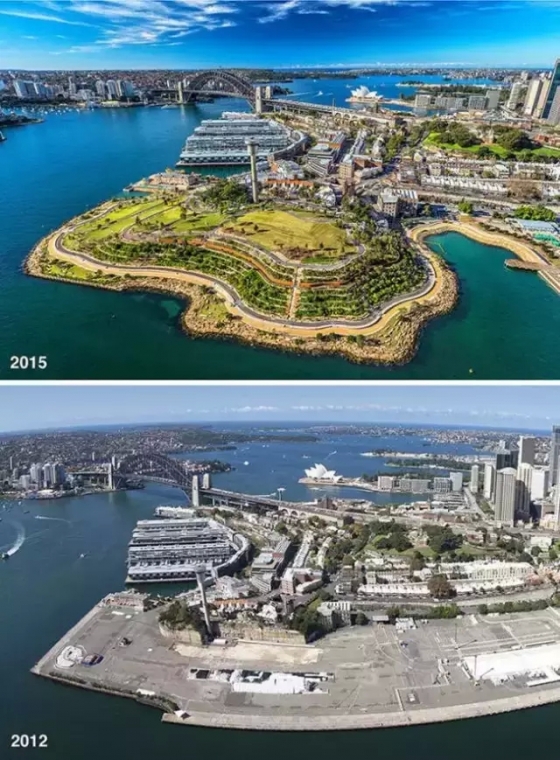 Barangaroo Headland Park修建在悉尼灣一個(gè)被人們遺忘已久的碼頭上,新建的公園將這里的歷史變遷及自然演變?nèi)诤显谝黄?并在地下修建了一個(gè)文化中心、沿著海岸線增建了人行道和自行車道,一條砂巖墻將兩者分開。此外,設(shè)計(jì)師選用了本土植物,并用相同灌木叢的反復(fù)出現(xiàn)來(lái)豐富景致。