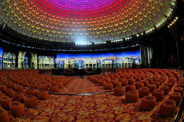 梵宮中最重要的地方莫過于圣壇,這是一個集會議、演出、參觀于一體的圓形場館,也是世界佛教論壇的主會場。建筑面積達(dá)35000平方米,可以舉行2000人的大型國際會議。圣壇上方是高度達(dá)30多米的巨大穹頂,1500盞金光燦燦的蓮花燈瞬間開啟,剎那間千余盞由電腦控制的LED光源拱聚穹頂,仿佛星光燦爛的天穹,可以變幻出1100多種燈光變化。三維立體的舞臺,可以在1分半鐘內(nèi),在舞臺中央“長出”一棵10米高、12米寬、11萬余片樹葉的參天菩提大樹。同時,在幾十臺大型投影設(shè)備和目前世界最為先進(jìn)的數(shù)字燈光控制系統(tǒng)綜合作用下,營造出一種既似如夢如幻、又似身臨其境的美妙景象。由林兆華、何訓(xùn)田等組成的國內(nèi)頂尖團(tuán)隊(duì)導(dǎo)演排練的,以弘揚(yáng)傳統(tǒng)文化、啟迪心靈智慧為主旨的大型情境演出《覺悟之路》就在此上演。
