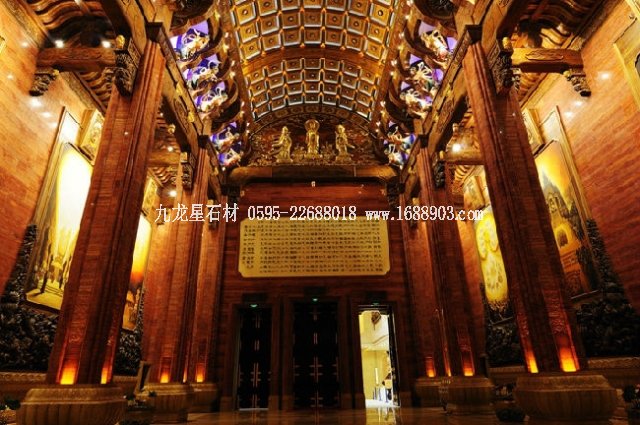 梵宮的內(nèi)部,舉目可見東陽木雕、敦煌壁畫、揚(yáng)州漆器、景泰藍(lán)、琉璃、溫州甌塑等等藝術(shù)珍品。能將如此眾多的中國非物質(zhì)文化遺產(chǎn)納入一座建筑的,目前似乎只有梵宮,也因此,有人稱它為“東方的盧浮宮”。由于梵宮顛覆了中式宗教建筑的傳統(tǒng)理念,舍棄了中國傳統(tǒng)佛教建筑慣用的木頭、琉璃瓦等材料,而用鋼筋混凝土建造,因而為設(shè)計(jì)施工帶來了很大難度。