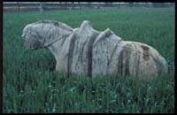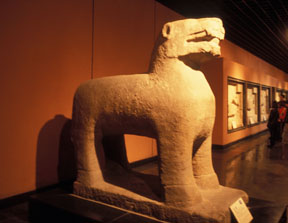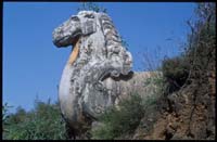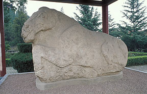 古代陵園石雕遺存實物最早的是引人注目的西漢霍去病墓石雕,作品原在陜西省興平縣漢武帝茂陵東面霍去病墓上與墓前?,F(xiàn)已發(fā)現(xiàn)的石雕作品有造型各異、天趣宛然的動物、人物等共十四件?;羧ゲ槲鳚h名將,漢武帝為表彰其功、紀念其人,于茂陵東面選定其墓址并“為冢象祁連山”,據《史記?衛(wèi)將軍驃騎傳?索隱》記:其墓“冢上有豎石,前有石馬相對,又有石人”。今存作品即記載中的部分原物。它們可以分為兩類,一是通常被稱之為“馬踏匈奴”的立馬,二是其它渚石。立馬的原在位置是墓前不遠,長年來未有大的移動,從形式上看為靜立姿態(tài),尺度適中,符合一般早期墓前石雕的制作規(guī)律,相信此即記載中相對而立的石馬,只是另一件已無存,“石人”也不見了。唐薛逢《漢武帝祠》詩云:“茂陵煙雨埋弓箭,石馬無聲蔓草寒”。詩中所指茂陵石馬當系帝陵制度,但與霍墓立馬的位置及造型表現(xiàn)肯定有直接關系。西漢時期陵園墓前設置石雕已成風氣,關于石人石獸的記載與遺存并不罕見,因此霍去病墓前石馬并非例外,實屬常規(guī)設置,它為我們提供了代所完善的石象生設置與造型形式之源的現(xiàn)知最早實物證據。
