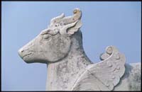 漢代墓葬手段逐漸完善之時,神靈的偶像也大規(guī)模出現(xiàn),它們體現(xiàn)著人們對神的認識、崇拜和依賴,它被認為會給陵墓帶來吉祥,給墓主靈魂以庇護和幫助,會驅逐鬼怪邪祟。魏晉南北朝時期這種偶像化更為明顯,為后代確定了神靈崇拜的偶像模式。陵園神道兩側列置著石雕天祿辟邪;墓室里陳放著陶塑的鎮(zhèn)墓獸;壁畫描繪著羽人、飛天、神靈;墓門棺槨上也刻劃著方相氏的形象。前代的這種審美表現(xiàn)因素影響著唐陵石雕藝術表現(xiàn)的一個重要方面,即歸結出天馬、天鹿等神靈崇拜的占有一定比例的造型表現(xiàn)部分。末陵石雕的角端、瑞禽明清陵園石雕的麒麟、獬豸等都是這種基礎內容模式的演變。先民們試圖通過陵墓這一特殊的環(huán)境達到人與神的有效溝通,在這個意義上造型手段起著關鍵性作用。陵墓被視為人神共處的理想化的虛幻而可信的環(huán)境,在這里天國、人間、地獄融為一體,形成完整的世界。可以說,對神靈的崇拜心理和原始宗教的世界觀是決定墓葬表現(xiàn)形式的重要因素。