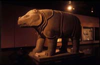 與石虎同列的石犀運用著相似的寫實手法,它明確強調了犀牛的褶皺皮膚和粗重身軀,真實刻劃著對象的體征。與石虎不同的是石犀身上刻有細密的魚鱗紋;這種非寫實的線刻紋可能是顯示犀牛皮膚粗糙感的表意性處理。實際上在龐然大物表面分布的細密的魚鱗紋在拉開視距觀察時給人的視覺感受正是皮膚粗糙感。