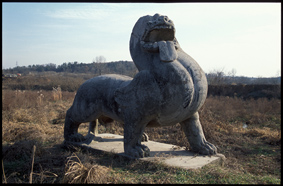 中原地區(qū)從戰(zhàn)國秦漢興起的在墓前設置石雕人物、動物雕像的風氣在唐代已經波及到少數(shù)民族居住地區(qū),但由于各自不同的生存環(huán)境、文化傳統(tǒng)、生活方式及受到外來文化影響程度等原因,石雕作品的內容與形式和中原密切聯(lián)系的同時又有明顯差異。位于吉林省敦化縣的渤海國前期王族墓地現(xiàn)存石獅兩尊,造型與中原唐陵早期作品十分相似,同時不失北方部族藝術的雄渾質樸風氣,顯示了中原文化的明顯滲透。