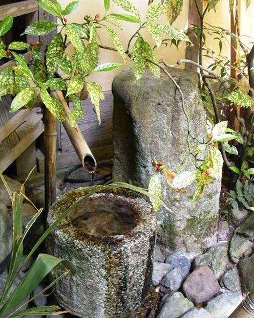 高的洗手缽近一米高,而小的洗手缽只不過20-30 厘米高。這種低的洗手缽稱為蹲踞。通常,園林中的洗手缽是用一個(gè)巨石,外形做成各式各樣。于是有了各式各樣的名稱,如菊花形、伊勢井口組合形、刻“布泉”的錢形、寶篋印塔形、鹽壇形、伊勢巖形、橋樁形、日本扁柏木形、菱形、方柱星字形、難波寺形等形狀的洗手缽。在踏腳石與洗手缽之間有一堆小卵石稱為疏水石。作為洗手缽石組,它不僅是一個(gè)洗手缽,而是多個(gè)景石。一般的構(gòu)成是,以墊有石基的洗手缽為中心,周圍有幾個(gè)用以打水、洗手和站立的伴石。由圍石發(fā)展到單個(gè)洗手缽,再由單個(gè)洗手缽發(fā)展到一個(gè)蹲踞石組,也經(jīng)歷了漫長的歷程。