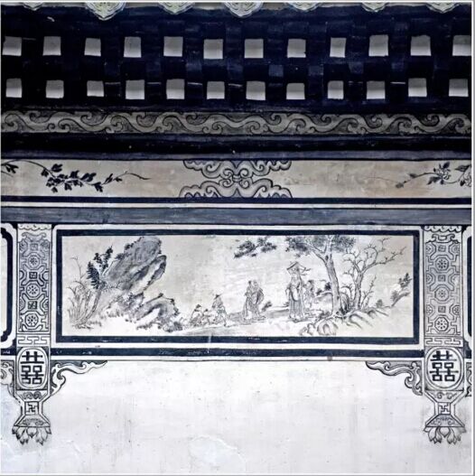本譜壁畫位于經(jīng)畬堂照墻內(nèi)墻封檐下部位,以道教神話故事為題材,采用國畫手法,表現(xiàn)司祿星、壽星與正財(cái)神形象。整幅壁畫分為三段,上段用墨線勾畫(白描)連續(xù)的纏枝番蓮紋。中段白描如意云頭組合紋飾,以及纏枝花卉;下段用掛落柱式,分成若干仔屜,每個(gè)仔屜內(nèi)用國畫法繪山水人物。圖中僅表現(xiàn)一個(gè)仔屜,左側(cè)為山石雜樹,用筆勾畫,點(diǎn)苔,淺墨色暈染。人物采用白描畫法,司祿星居右,老壽星居中,財(cái)神趙公明居左,旁有仙僮。右側(cè)襯以松樹林柯圖。