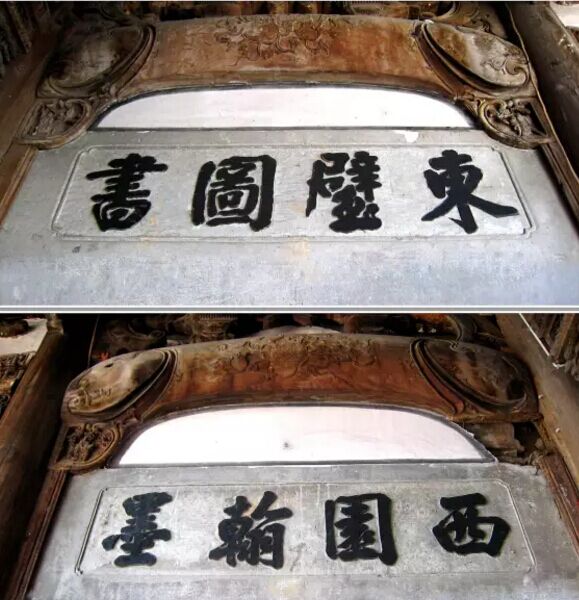 繼志堂正廳山墻前廊兩端的龍虎門,門額嵌青石匾,矩形框,剔地起突,陽刻楷書黑漆:“東璧圖書”“西園翰墨”四字匾,字體遒勁有力。門額采用互文手法,比喻這個(gè)地方到處有古籍和文壇雅集,是很有文化氛圍的地方。此聯(lián)出典自唐代張說的《恩賜麗正殿書院賜宴應(yīng)制得林字》:“東璧圖書府,西園翰墨林。”據(jù)史書載,漢代丞相蕭何在未央宮建天祿、石渠二閣,以藏歷代典籍和檔案文獻(xiàn)。魏晉時(shí)期建“西園”以宴建安七子,宋代馬遠(yuǎn)繪《西園雅集圖》傳世,米芾、張士奇作記。