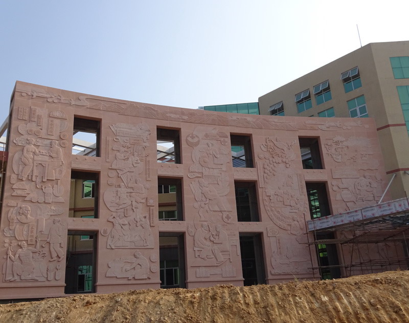大樓高約14.4米,總長約60.4米,由純天然光澤紅制作浮雕墻面,以淺浮雕的方式制作而成。