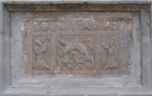 為分體式。裙面分為3個方框,中間大框內(nèi)雕屋外古樹下影壁前,一官人模樣者向站立的一老婦人跪拜,老婦人身著寬袖衣,下著長裙,手持拐杖,站立門前,此當為急于見老母的孝子朱壽昌,即畫面表現(xiàn)的是“二十四孝”之一的“棄官尋母”。從雕刻手法看,其為清代中后期作品。