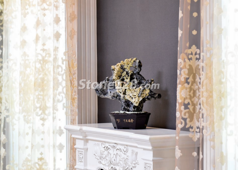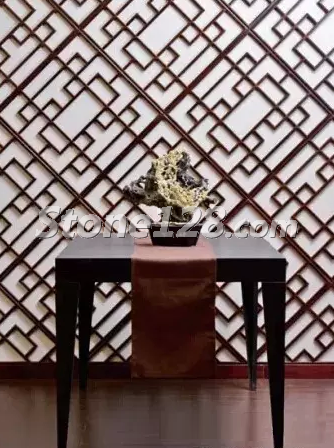 在新中式風格的大廳中,石雕作品的外形與背景窗花的菱形相互協(xié)調(diào),取得了很好的諧調(diào)效果。石雕的色彩與整體環(huán)境的深色調(diào)相互統(tǒng)一,臘梅花典雅的黃色又活躍了色彩的意境氛圍。整體空間的直線風格與石雕作品的曲線造型相對比,剛?cè)嵯酀?收放有度,取得了很好的視覺效果。
