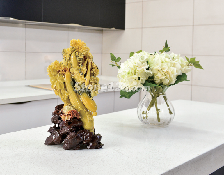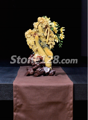 擺放在餐廳,既有美滿和諧的氛圍,又有艱苦奮斗的寓意。作品的曲線造型與餐廳環(huán)境的直線造型相互彌補,中和了各自的不足。深色的餐桌及背景很好地襯托了淺色的石雕作品,給整個空間注入了生命力。