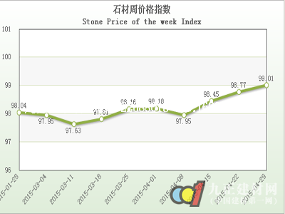 從4月石材周價格指數(shù)走勢圖看,本月石材周價格指數(shù)除2015-04-08期略下調(diào)外,總體基本呈現(xiàn)一路平緩?fù)粕淖邉?價格循序漸進調(diào)整。