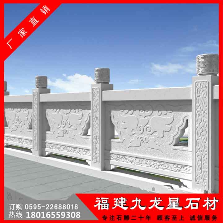 石雕欄桿是橋梁或建筑上的安全防護設(shè)施,欄桿不但要求堅固,起到一定的防護作用,而其還要注意美觀,起到美化建筑的作用。石雕欄桿優(yōu)點很多,最重要的是容易清洗,看起來高端大氣,質(zhì)量也好,并且給人非常充實的感覺。而實用性上,石材的欄桿可以使用更長的年限,且結(jié)實牢固,安全性上面也是有保障的。石雕欄桿有著美觀、時尚、環(huán)保、抗老化、不變形的性能優(yōu)點,可廣泛用于市政、水利、公園、橋梁欄桿等護欄工程。