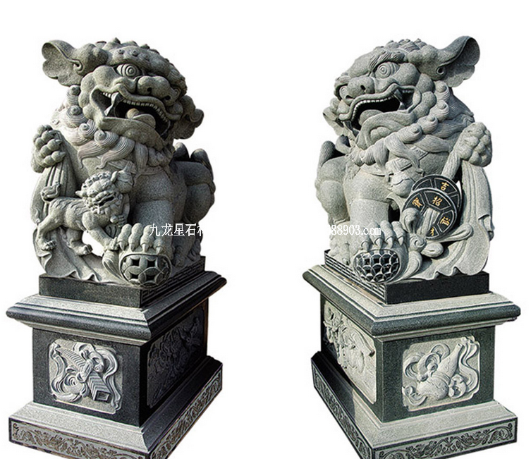 石雕獅子每尊不含基座高1.48米,采用整塊古田青石雕刻而成,南派惠安獻(xiàn)錢獅造型,右雌左雄,嘴里各叼一石珠子,通常放置廟宇或單位大門口,用來鎮(zhèn)宅消災(zāi),化解煞氣。