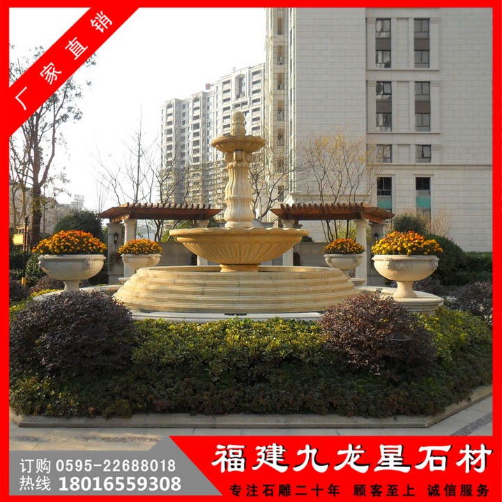 不僅可在水池中放置埃及米黃水缽,還可在水池邊景墻上設(shè)置埃及米黃水缽。一般選擇半圓埃及米黃水缽,大小根據(jù)景墻面積與設(shè)置個數(shù)。垂直方向可選擇設(shè)置一座半圓埃及米黃水缽,也可設(shè)置雙層埃及米黃水缽,乃至三層埃及米黃水缽,但埃及米黃水缽的大小應(yīng)由上而下從小到大。還可在景墻上設(shè)置埃及米黃獅子頭噴水雕塑,水池中放置花缽式埃及米黃水缽以此相對應(yīng)。